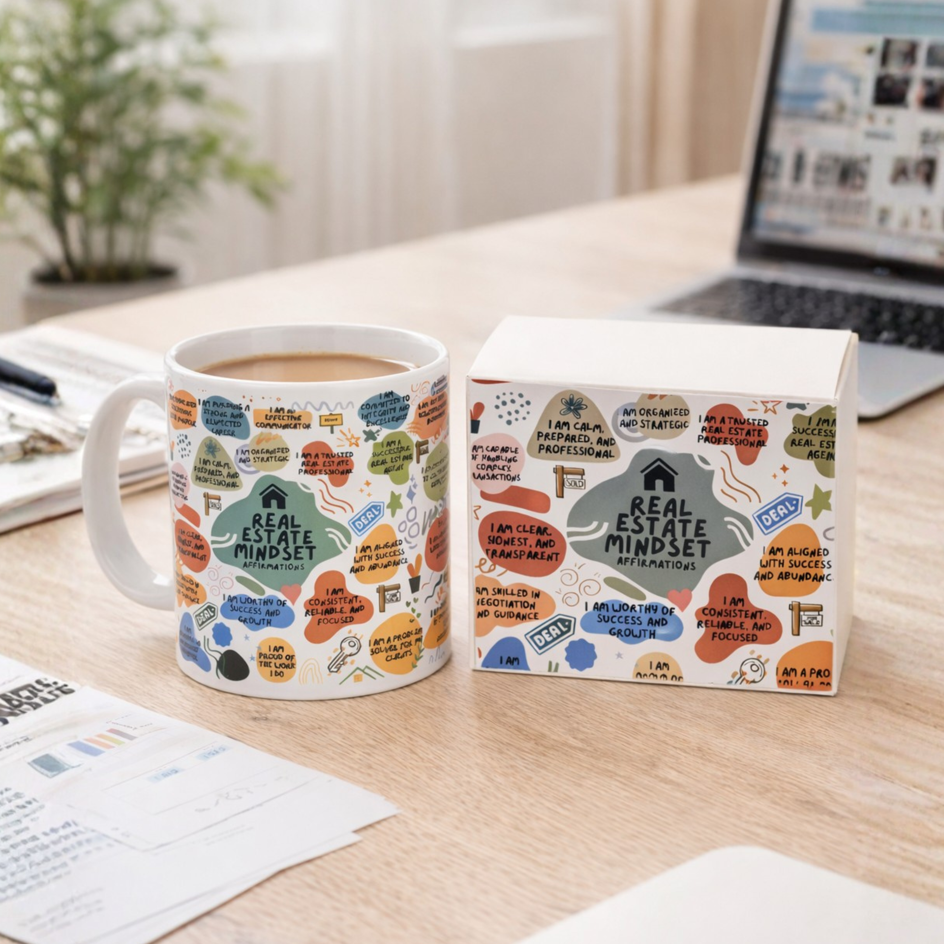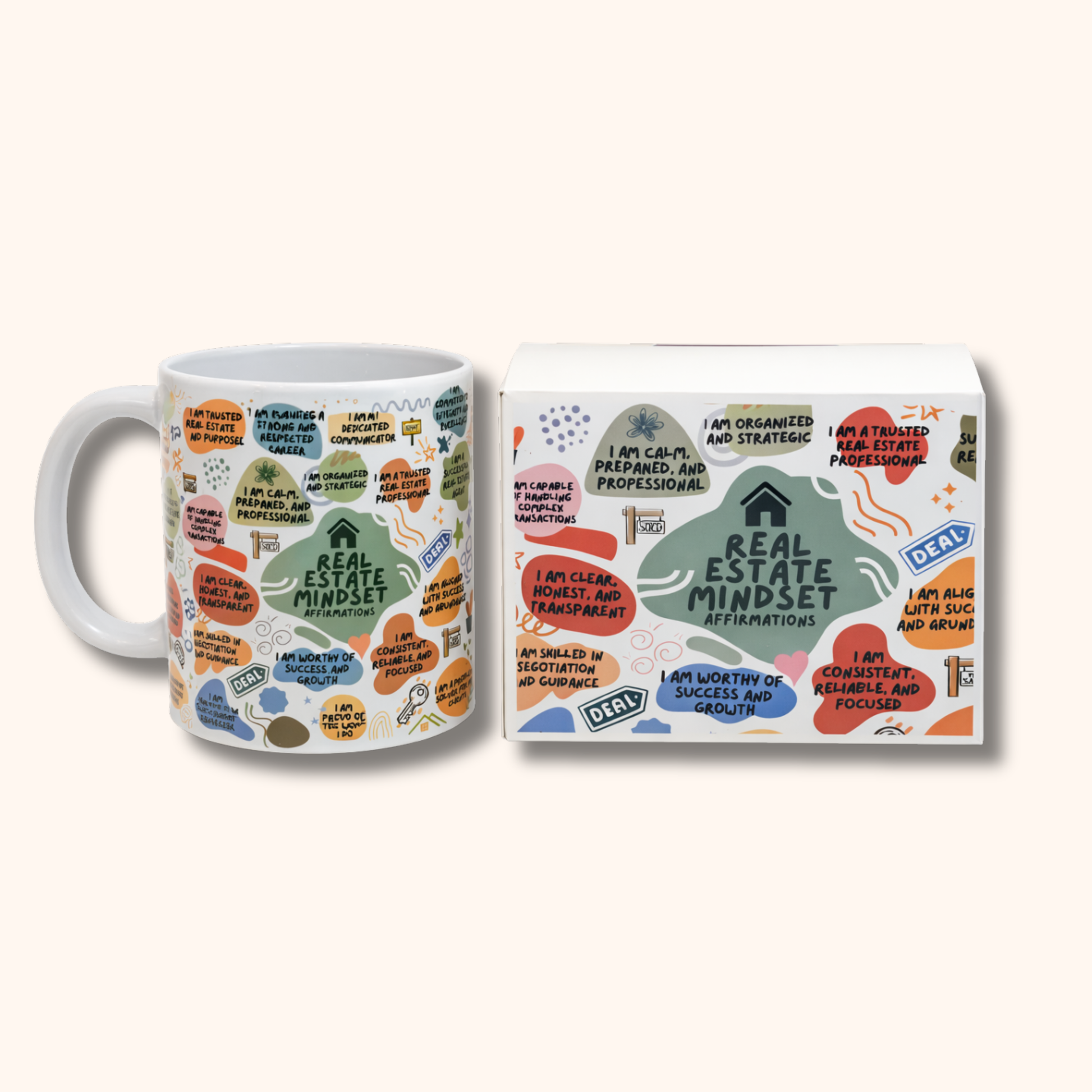 This ceramic mug features powerful mindset affirmations that remind you to stay focused, consistent, and aligned with abundance throughout your workday. Whether you’re preparing for client meetings, reviewing listings, or celebrating closings, this mug adds encouragement to every sip.